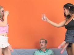 Girls ride guys anal with oversized belt cocks and ejaculate